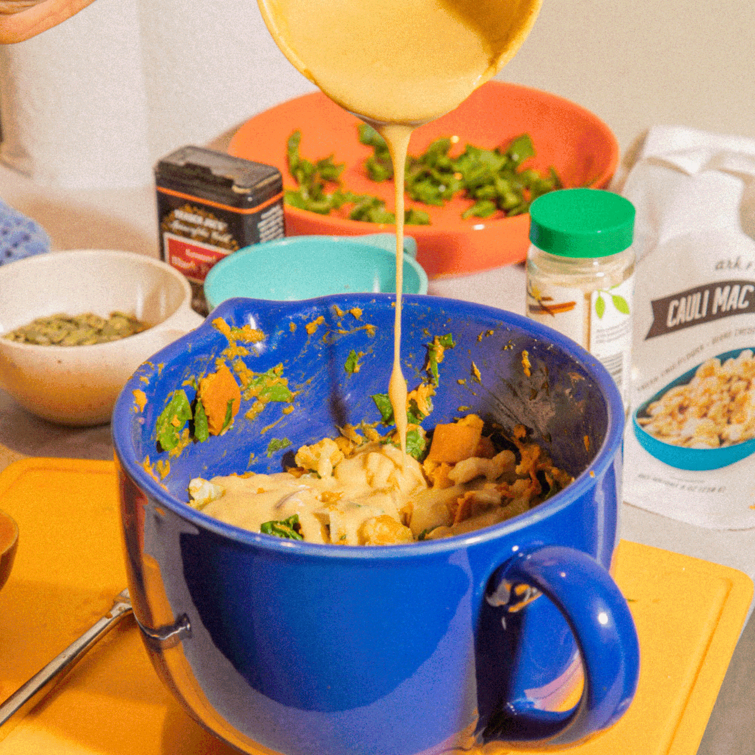 5. Toss the cooked veggies in the plant-based cheese sauce from the Ark Foods Cauli Mac + Cheese bowl. Sprinkle with sea salt, freshly ground pepper, and toasted pepitas and enjoy your seasonally inspired plant-based Mac + Cheese.